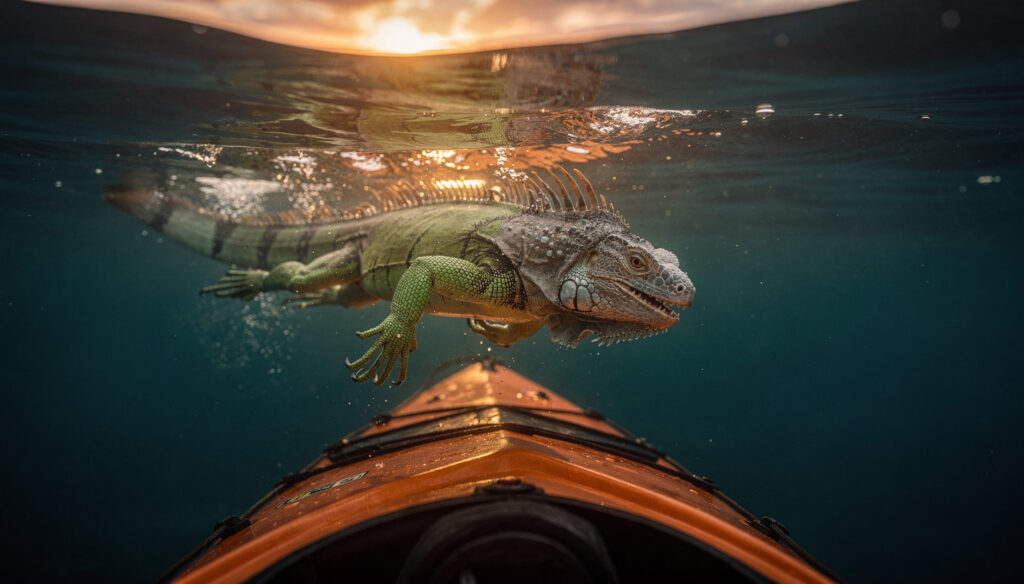 Steve squinted and saw spikes on its back. It was an iguana! A giant lizard swimming in salty water, surrounded by nothing but sharks and a strong current.