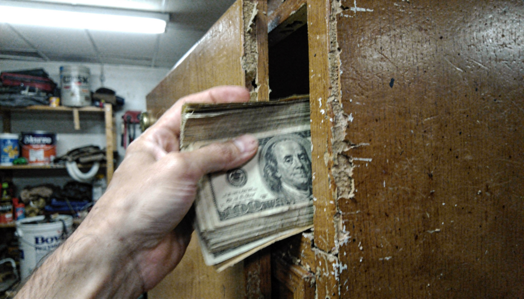 Larry opened a hidden cabinet in his garage and pulled out an envelope so heavy it sagged in his hands. Inside was a mountain of cash.
